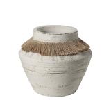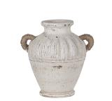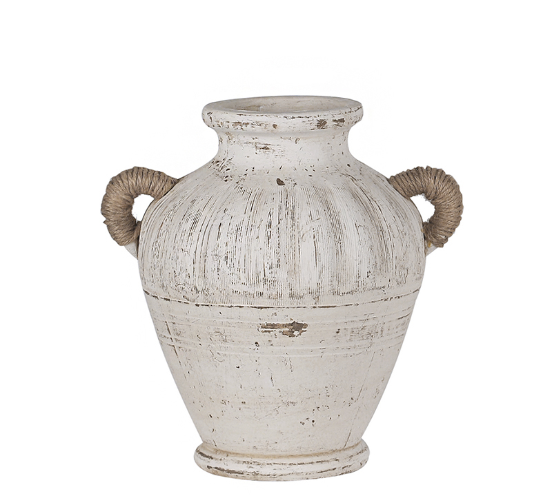 Το αντικείμενο στην εικόνα είναι ένα διακοσμητικό βάζο από τερακότα με σχοινένιες λαβές. Έχει παλαιωμένη (distressed) λευκή/κρεμ υφή καΔιαθέτει στρογγυλεμένο σώμα με κάθετες γραμμώσεις και δύο λαβές τυλιγμένες με φυσικό σχοινί (λινάρι ή γιούτα).ι ρουστίκ, αγροτικό (farmhouse) στυλ.
